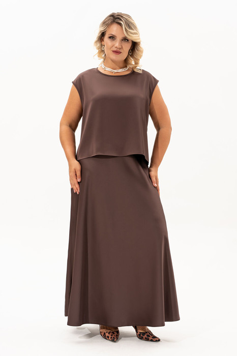 Нарядный  женский костюм  состоит из  атласной  юбки и блузы. Это стильное комфортное решение для женщин больших размеров, которые ценят комфорт и стиль. Костюм , состоящий из  атласной юбки-полусонце и блузы. Юбка- полусонце имеет небольшое количество фалд и поэтому не добавляет сильного объёма в районе бёдер. Поэтому эти юбки можно выбирать смелее всем видам фигур. По поясу в боковой части проложена эластичная тесьма, которая создаёт  удобную посадку. Спущенная линия плеча блузы в сочетании с круглой горловиной невероятно женственная и изящна. В этом костюме Вы будете выглядеть безупречно! Отличный вариант для офиса и вечернего гардероба, а также и просто  для повседневного применения. Грация, и изящество делают этот костюм уникальным.