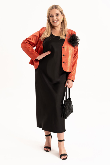 Элегантный женский комплект «двойка» больших размеров — идеальный выбор для женщин с пышными формами, который сочетает в себе комфорт, стиль и изящество. Модель состоит из двух элементов: лаконичного  платья из струящегося атласа, кроеного  по косой и  короткого жакета, полуприлегающего силуэта на подкладке. Такой тандем создает утонченный и женственный образ, который прекрасно подойдет как для вечерних выходов, торжеств, так и для повседневного ношения или работы в офисе.  Жакет полуприлегающего силуэта,  с центральной застёжкой на петли и  пуговицы и с рельефами от плеча по переду, закругленный низ борта. Спинка в жакете со средним швом . Рукав втачной, двухшовный, длинный.  Платье кроенное по косой, что обеспечивает красивую посадку и мягкое облегание по фигуре. Углубленная горловина добавляет лёгкой чувственности, а нагрудные вытачки от проймы подчёркивают линию груди.  В комплекте идет съемный цветок- брошь.