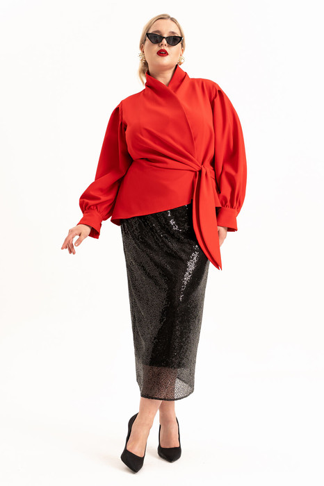 Элегантный женский костюм из ткани «марчано»  и паеток на трикотажной подкладке стильный и универсальный наряд для различных мероприятий. Данный женский костюм состоит из нарядной блузы  и роскошной юбки с паетками, что делает его идеальным решением для безупречного образа.На юбке обрабона потойная молния в боковом шве, пояс на резинке.  Блуза с отрезной баской  и воротником стойкой переходящей в борта. Застежка на потайную петлю и пуговицу и на завязки. Рукав длинный, втачной на манжете. По окату рукава обработаны складки. Благодаря универсальному дизайну, костюм можно успешно сочетать с различными элементами гардероба, создавая разнообразные стили от официального до повседневного. Стильный, роскошный, изысканный, комплект идеально подойдет для различных мероприятий. Отражает роскошь, придает элегантность и изысканность. Будет великолепно смотреться на любой фигуре и привлечет к вам внимание окружающих. Этот комплект идеальный выбор для тех, кто хочет выглядеть стильно и привлекательно на вечеринке или романтическом свидании. Сочетайте с красивыми аксессуарами и обувью на каблуке для завершения образа! Доступен в различных размерах, в том числе и для женщин пышных форм, этот костюм позволит каждой леди подобрать идеальный вариант. Красный цвет блузы и роскошная юбка из паеток подчеркнут вашу индивидуальность и хороший вкус.