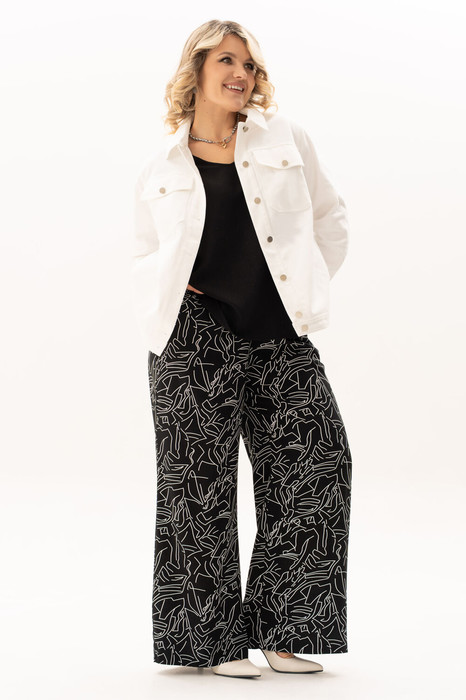 Стильный, современный, трендовый комплект с брюками для повседневной носки, торжественного мероприятия, в офис, школу или на прогулку. Приобретая один комплект, Вы покупаете несколько образов, каждая единица которого универсальна, поэтому может сочетаться со многими вещами из Вашего гардероба. Стильный вариант для красивого женского образа – сочетание белого джинсового жакета с брюками прямого кроя "палацо" из принтованной ткани и контрастной майкой. Жакет-куртка прямого кроя с рельефными швами и кокетками по переду и спинке, накладные карманы с клапанами и декоративные металлизированные пуговицы -  узнаваемые нотки вневременной джинсовой мелодии. Жакет просто необходим при создании как романтического, так и спортивного образа. Майка с рукавом «крылышко», горловина углубленная V-образной формы. Брюки  с боковыми карманами и поясом частично на резинке. Не упустите возможность приобрести брючный комплект с большим выбором размеров и ощутить комфорт в носке качественной и стильной одежды!