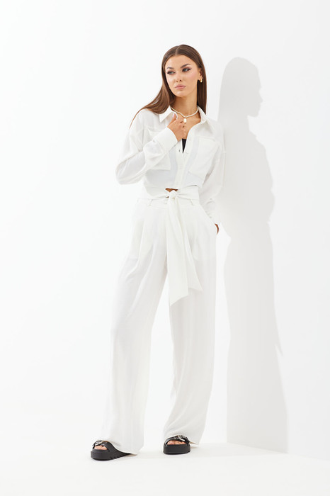 Блуза свободной формы (оверсайз), покроя спущенное плечо с центрально-бортовой застежкой на планку и петли-пуговицы. Длина блузы до талии. Рукава длинные, с манжетой по низу на две пуговицы. В области груди настрочены накладные карманы. Низ блузы оформлен манжетой, по спинке в центральной части с резинкой и впереди с завязкой.