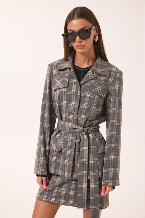 Комплект женский, состоит из жакета, юбки и джемпера. Жакет и юбка выполнены из ткани в клетку, джемпер из трикотажного полотна.