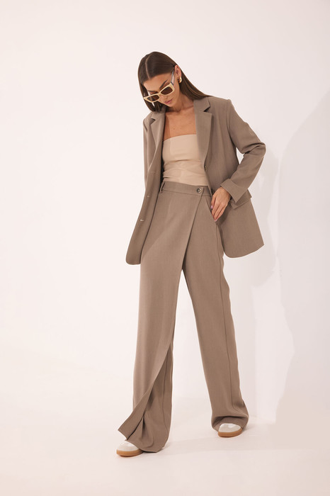 Брюки свободной формы, спереди с запахом. Запах выполнен из правого бокового шва и пристегивается на петли-пуговицы на поясе. Возможно носить не застегивая, виде драпировки по правой боковой части. Верхний срез брюк обработан поясом, по спинке вставлена резинка. Застежка на молнию и в поясе – петля-пуговица. В боковых швах передних половинок расположены наклонные карманы. По передним половинкам и запахе – шлевки.