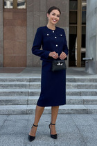 Жакет свободной формы с расширенной линией плеча, на двубортную застежку. На жакете так же пришита третья пуговица, при застегивании на нее силуэт меняется на приталенный. Воротник пиджачного типа, борта внизу закругленные. Рукав длинный двухшовный. По переду отрезной бочок и прорезные карманы в рамку, с клапанами. На правой полочке сверху листочка с втачными концами. Спинка со средним швом и бочками.