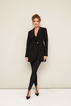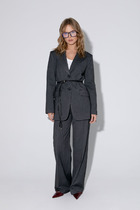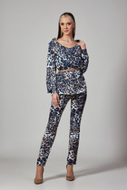 Костюм женский, состоящий из блузы и брюк, выполнен из ткани в полоску.