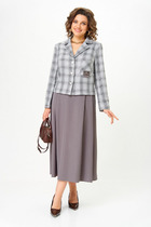 Жакет свободной формы с расширенной линией плеча, на двубортную застежку. На жакете так же пришита третья пуговица, при застегивании на нее силуэт меняется на приталенный. Воротник пиджачного типа, борта внизу закругленные. Рукав длинный двухшовный. По переду отрезной бочок и прорезные карманы в рамку, с клапанами. На правой полочке сверху листочка с втачными концами. Спинка со средним швом и бочками.