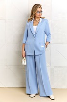 Комплект женский, состоящий из жакета и брюк, с поясом из основной ткани с декоративной пряжкой.