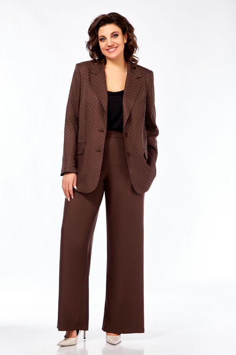 Нереально стильный костюм, жакет прямого силуэта, ткань со стразами, с застежкой на две пуговицы, карманы с клапанами, рукав втачной двухшовный, со стильным элементом-  шлица-обманка на внутреннем шве на 3 пуговицы.  Брюки-палаццо, с карманами в боковых швах, пояс по спинке на резинке. Брюки из ткани без страз.