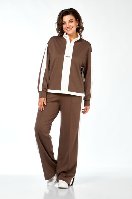Костюм женский спорт-шик. Джемпер прямого силуэта, со спущенным рукавом. Воротник-стойка из отделочной ткани, планка по центру, в которой вставлена молния, декаротивная нашивка. Рукав с планками из отделочной ткани и декоративные защипы на манжетах. По низу кулиска с фиксаторами. Брюки прямые, по переду застрочены стрелки, по внешней стороне отделочные детали с разрезами по низу. Карманы в боковых швах, пояс на резинке.