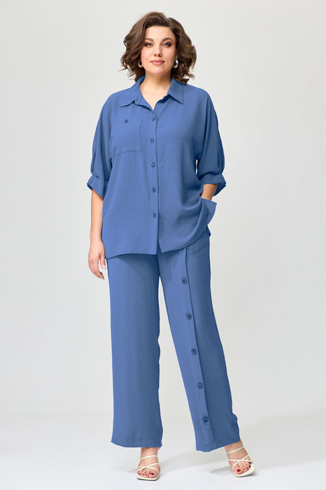 Брюки прямые. Верхний срез обработан поясом по спинке на резинке. На левой половине переда по центру расположены декоративные складки фиксирующиеся пуговицами. В боковых швах расположены карманы.