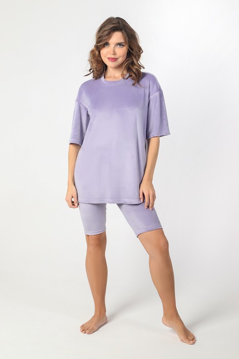 Костюм из гладкокрашеного трикотажного полотна «велюр стрейч», состоящий из футболки и леггинсов. Футболка – удлиненная, свободного покроя, со спущенной, линией плеча, короткими втачными рукавами, горловиной овальной формы, обработанной втачной планкой.Леггинсы – длиной до колен, с эластичной тесьмой по талии.
