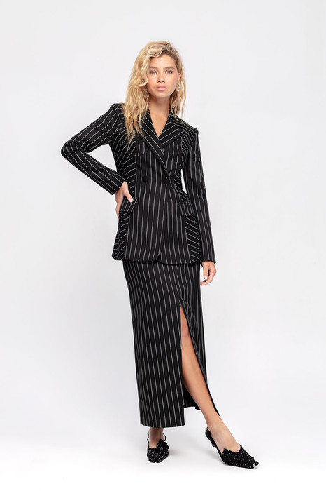 Костюм-двойка из приталенного жакета и макси-юбки из текстильной ткани в полоску