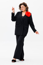 Текстильный комплект-тройка из классического полуприлегающего жакета, базовой трикотажной майки и широких прямых брюк. Детали: жакет полуприлегающего силуэта, талиевые вытачки, пиджачный воротник, застежка на две петли и пуговицы, функциональные карманы, жакет на подкладке. Майка из трикотажа- «лапша», глубокие вырезы горловины и пройм. Брюки с высокой посадкой на притачном поясе со шлевками, застежка на молнию и пуговицу, боковые карманы, передние половины с заутюженными стрелками и двумя небольшими складками.