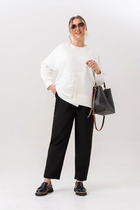 Текстильный костюм-двойка из двубортного оверсайз жакета и прямых брюк с высокой посадкой. Детали: жакет прямого силуэта, пиджачный воротник, прорезные карманы, спинка со средним швом, втачные двухшовные рукава, жакет на подкладке. Брюки на притачном поясе со шлевками, передние половины с небольшими мягкими складками и заутюженными стрелками, застежка на молнию и пуговицу, боковые карманы.