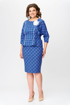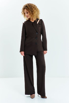 Костюм-двойка из полуприлегающего жакета со шлицами и широких брюк. Детали: пиджачный воротник, талиевые вытачки, перед с функциональным нагрудным карманом и двумя прорезными карманами, застежка на пуговицы, спинка со средним швом и шлицей, рукава втачные двухшовные со шлицами по низу, жакет на подкладке. Брюки с высокой посадкой на притачном поясе со шлевками, передние половины с небольшими застроченными мягкими складками и заутюженными стрелками, застежка на молнию и пуговицу, боковые карманы.