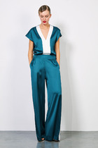 Костюм-двойка из оверсайз жакета и прямых широких брюк со стрелками из текстильной ткани. Детали: жакет прямого силуэта, расширенная линия плеч, пиджачный воротник, перед с прорезными функциональными карманами, однобортная застежка на петли и пуговицы, спинка со средним швом и шлицей, рукава втачные двухшовные, жакет на подкладке. Брюки с высокой посадкой на притачном поясе со шлевками, пояс прямой без резинки, застежка на молнию и пуговицу, боковые карманы, передние половины с заутюженными стрелками и двумя небольшими складками. Задние части брюк с вытачками и заутюженными стрелками.