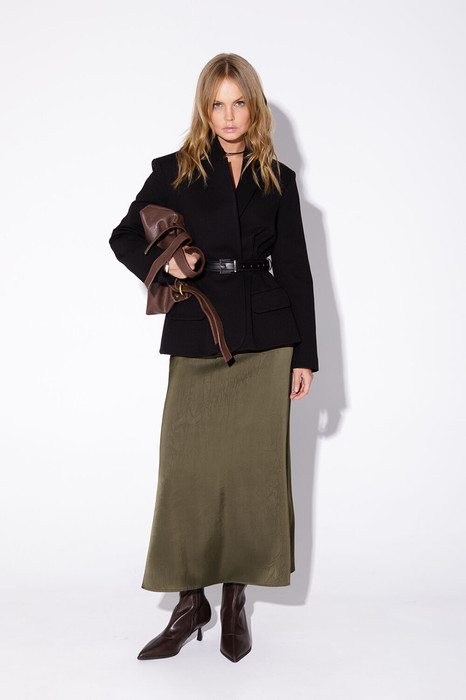 Комплект-двойка из укороченного приталенного жакета со складками из плотного утепленного трикотажа и атласной юбки длины макси.