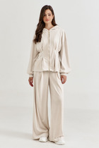 Костюм-двойка из жакета со шнуровкой по талии и миди-юбки из экокожи.