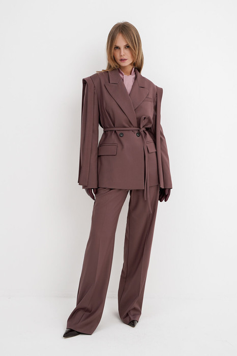 Детали: жакет свободного покроя и полуприлегающего силуэта, двубортная застежка на петли и пуговицы, отрезные бочки, пиджачный воротник, функциональные карманы, жакет на подкладке, съемный пояс. Брюки с притачным поясом со шлевками, передние половины с небольшими застроченными мягкими складками и заутюженными стрелками, застежка на молнию и пуговицу, боковые карманы. Задние части брюк с вытачками и заутюженными стрелками. Пояс брюк прямой, без резинки.