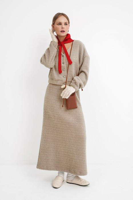 Костюм-двойка из укороченного бомбера и юбки из пушистой ткани.