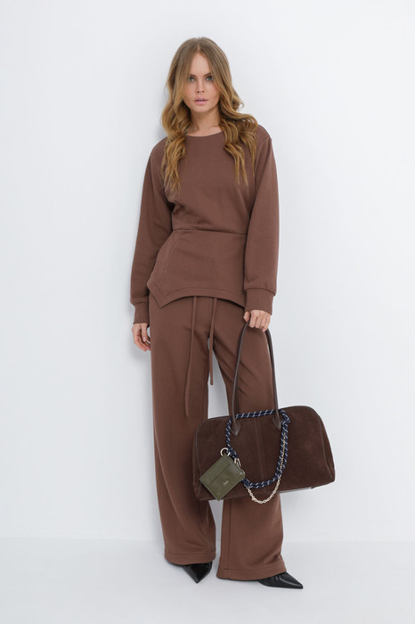 Трикотажный костюм-двойка из приталенного джемпера и свободных брюк.