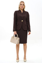 Детали: туника приталенного силуэта, широкая горловина переда и спинки, талиевые вытачки, фигурный низ, потайная застежка-молния в среднем шве спинки. Брюки с высокой посадкой, передние половины брюк с двумя складками, эластичный пояс-резинка, боковые карманы, без застежки.