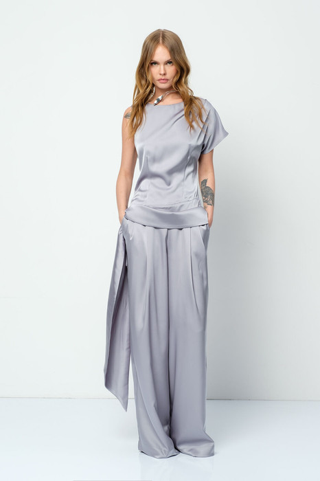 Атласный костюм-двойка из приталенной асимметричной блузы и широких брюк.