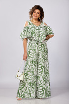 Детали: туника приталенного силуэта, широкая горловина переда и спинки, талиевые вытачки, фигурный низ, потайная застежка-молния в среднем шве спинки. Брюки с высокой посадкой, передние половины брюк с двумя складками, эластичный пояс-резинка, боковые карманы, без застежки.