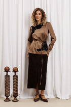 Детали: жилет прямого силуэта, талиевые вытачки переда и спинки, пиджачный воротник, застежка на пришивные кнопки, спинка со средним швом и шлицей, функциональные карманы, жилет на подкладке, в комплекте пояс из основной ткани и чёрный пояс-шнурок из кожзама. Брюки с высокой посадкой, притачной пояс со шлевками, передние половины с небольшими застроченными мягкими складками и заутюженными стрелками, застежка на молнию и пуговицу, боковые карманы. Задние части брюк с вытачками и заутюженными стрелками. Пояс брюк прямой, без резинки.