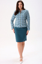 Детали: жилет прямого силуэта, талиевые вытачки переда и спинки, пиджачный воротник, застежка на пришивные кнопки, спинка со средним швом и шлицей, функциональные карманы, жилет на подкладке, в комплекте пояс из основной ткани и чёрный пояс-шнурок из кожзама. Брюки с высокой посадкой, притачной пояс со шлевками, передние половины с небольшими застроченными мягкими складками и заутюженными стрелками, застежка на молнию и пуговицу, боковые карманы. Задние части брюк с вытачками и заутюженными стрелками. Пояс брюк прямой, без резинки.