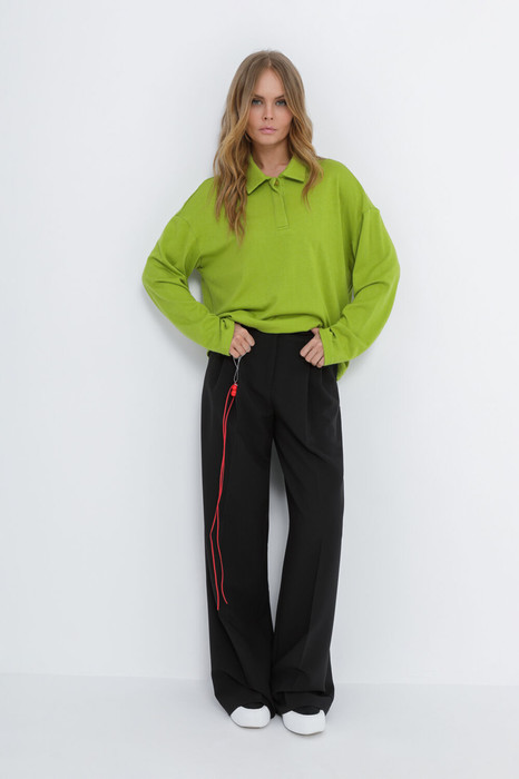 Детали: поло прямого силуэта, свободный покрой, спущенная линия плеча, потайная застежка на петли и пуговицы, длинные рукава. Широкие брюки-палаццо с небольшими складками у пояса и заутюженными стрелками, притачной пояс со шлевками, застежка на молнию и пуговицу, боковые карманы. Задние части брюк с вытачками и имитацией карманов.