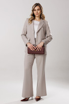 Костюм-двойка из приталенного жилета с воротником-стойкой и широких прямых брюк из текстильной ткани.
