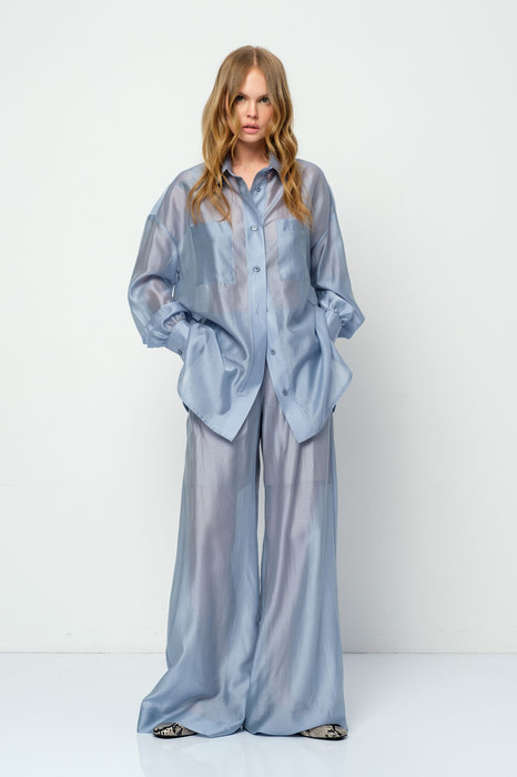 Полупрозрачный костюм-двойка из свободной рубашки и широких брюк на резинке.