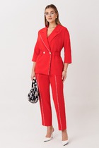 Детали: блуза полуприлегающего силуэта, свободный покрой, спущенная линия плеча, шалевый воротник, длинные широкие рукава с высокой подгибкой. карманы в боковых швах. Брюки с эластичным поясом, высокие разрезы, без застежки, без карманов, брюки на подкладке из основной ткани.