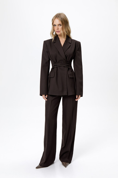 Костюм-двойка из жакета со шнуровкой и широких прямых брюк.