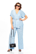 Детали: жилет прямого силуэта, талиевые вытачки переда и спинки, пиджачный воротник, застежка на пришивные кнопки, спинка со средним швом и шлицей, функциональные карманы, жилет на подкладке, в комплекте пояс из основной ткани и чёрный пояс-шнурок из кожзама. Брюки с высокой посадкой, притачной пояс со шлевками, передние половины с небольшими застроченными мягкими складками и заутюженными стрелками, застежка на молнию и пуговицу, боковые карманы. Задние части брюк с вытачками и заутюженными стрелками. Пояс брюк прямой, без резинки.