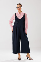 Комплект 2-предметный, состоящий из жакета и брюк, выполненный из костюмной ткани. Жакет прямого силуэта, с центральной застежкой на петлю и пуговицу. Воротник пиджачного типа с отложными лацканами. Спереди обработаны накладные карманы. Рукава втачные, двухшовные. Жакет на подкладке. Брюки прямого силуэта слегка зауженные к низу, с заутюженными стрелками и с боковыми наклонными карманами. Застежка на пуговицу и тесьму-молнию. Пояс притачной на резинке для регуляции размера. На задних половинках брюк обработаны карманы с листочками.