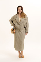 Жакет актуального полуприлегающего силуэта, с центральной застежкой на петли и пуговицы. Воротник пиджачного типа с отложными лацканами. Спереди обработаны прорезные карманы в рамку с клапанами. Рукава втачные двухшовные со шлицей и отделочной подкладкой.