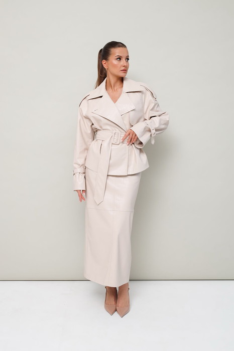 Стильный 2-предметный комплект, состоящий из жакета и юбки, выполненный из экокожи.