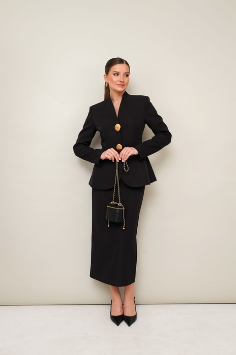 Жакет прилегающего силуэта, слегка расширенный к низу. Горловина с цельнокроеной стойкой и V-образным вырезом. Центральная застёжка на потайные пришивные кнопки с декоративными акцентными пуговицами. Рукава втачные, двухшовные. Спинка с рельефами и средним швом.