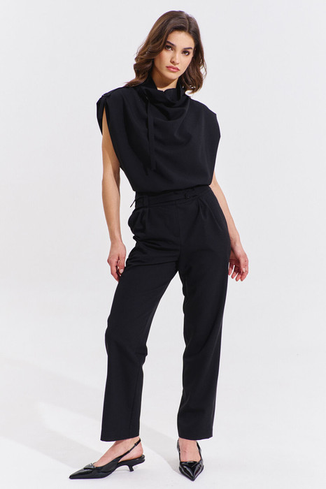 Брюки зауженные к низу, длиной чуть ниже щиколотки. Задние половинки с талиевыми вытачками. Передние половинки с односторонними складками и карманами с наклонным входом. Брюки с притачным широким поясом-обтачкой. Застежка по переду на тесьму-«молнию» с гульфиком и откоском. По поясу настрочены паты с полукольцами.
