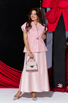 Комплект женский, состоящий из блузки и юбки. Блузка свободного кроя, длиной до бедер. Спинка со средним швом, в котором по горловине обработана застежка на навесную петлю и пуговицу. По переду нагрудные вытачки. Блузка без рукавов, с фигурной проймой. Горловина округлой формы. Юбка прямого силуэта, длиной чуть ниже щиколотки. Заднее полотнище с талиевыми вытачками и средним швом. Переднее полотнище со средним швом, в котором обработан высокий разрез, с боковыми карманами с наклонным входом с клапанами. На клапанах пришиты пуговицы. В среднем шве переда обработана застежка на тесьму-«молнию» с гульфиком и откоском. юбка на притачном поясе с фигурным уступом по переду, с резинкой по спинке. По поясу вставлены шлевки. Пояс с застежкой на петлю и пуговицу. По поясу застежка на петлю и пуговицу.