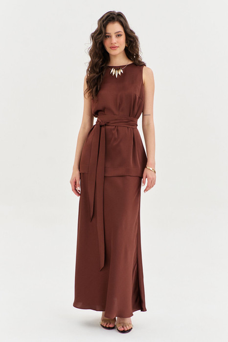 Комплект женский, состоящий из блузки и юбки. Блузка свободного кроя, длиной ниже линии бедер. Спинка со средним швом, в котором по горловине обработана застежка на навесную петлю и пуговицу. По переду нагрудные вытачки. Блузка без рукавов. Горловина округлой формы. блузку дополняет съемный пояс. Юбка А-образного силуэта, длиной чуть ниже щиколотки. Верхний срез юбки обработан резинкой.