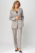 Костюм женский, предназначен для повседневной носки. Костюм женский 2-х предметный джемпер и юбка. Джемпер женский, прямого силуэта, длиной до линии бёдер с фигурным низом. Перед с одной нагрудной вытачкой с отрезным бочком слева, шов соединения бочка с передом заканчивается шлицей, декорированной 3-мя пришивными пуговицами. Спинка цельнокроеная. Горловина круглая с втачной планкой-стойкой из отделочной ткани. Рукав втачной, длинный, одно шовный, низ с лёгкой сборкой и притачной манжетой из отделочной ткани. Джемпер с плечевыми накладками. Юбка женская, слегка заужена к низу, длиной до нижней части икры. Переднее и заднее полотнище цельнокроеные. Боковые швы с разрезами. Юбка с притачным поясом, собранным на эластичную тесьму. Юбка на подкладке. Длина юбки по боковому срезу 87 см. Длина спинки джемпера 60 см. Длина рукава 59 см.