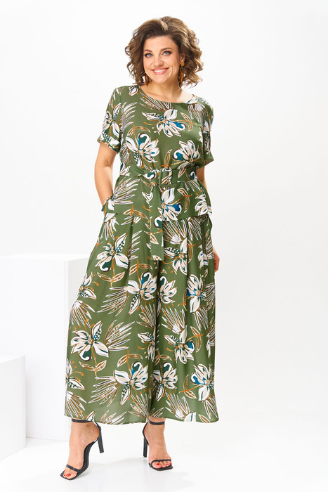 Костюм женский предназначен для повседневной носки. Костюм женский 2-х предметный блузка и юбка-брюки. Блузка женская прямого силуэта, длиной до линии бёдер. Перед с 2-мя нагрудными вытачками. Спинка с отрезной кокеткой, с 1-ной встречной складкой, кокетка декорирована пришивной металлической пластиной. Боковые швы с разрезами. Горловина круглая, обточная, без воротника. Рукав втачной одно шовный, короткий, с приточной отложной манжетой. Блузка без плечевых накладок. Юбка-брюки длинные широкие. Передние половинки с карманами в боковых швах с 2-мя односторонними зафиксированными складками на каждой половинке. Задние без конструктивных особенностей. Пояс притачной, собран на эластичную тесьму, закреплённую 2-мя отделочными строчками. Длина брюк по боковому срезу 90 см. Длина спинки блузона 56 см, длина рукава 22 см.