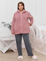 Костюм женский предназначен для повседневной носки. Костюм женский 2-х предметный блузон и юбка-брюки. Блузон прямого силуэта, длиной до линии бёдер с низом "ступенька". Перед с 2-мя нагрудными вытачками. Спинка цельнокроеная. Горловина круглая, обточная, без воротника. Рукав втачной, 2-х шовный, длиной 3/4. Блузон без плечевых накладок. Юбка-брюки длинные, широкие. Передние половинки с карманами в боковых швах с 2-мя зафиксированными односторонними складками с каждой стороны. Задние половинки без конструктивных особенностей. Юбка-брюки с приточным поясом, собранным частично на эластичную тесьму, закреплённую 2-мя отделочными строчками. К костюму прилагается съёмный пояс с пряжкой и 2-ю пробивными блочками. Длина брюк по боковому срезу 93см. Длина спинки блузона 64 см, длина рукава 49 см.