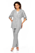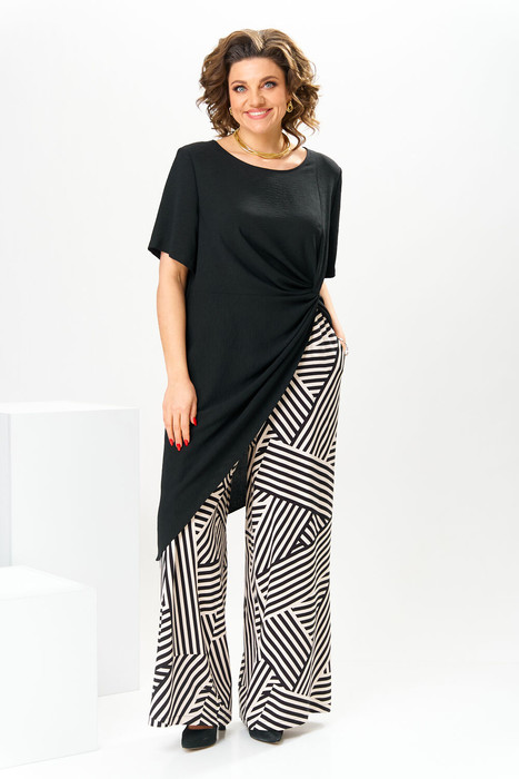 Костюм женский, предназначен для повседневной носки. Костюм женский, 2-х предметный, туника и брюки. Туника полу прилегающего силуэта, длиной до колена с фигурным низом. Перед отрезной по линии талии, верхняя часть с отрезным справа, нижняя часть с отрезным бочком, на уровне линии талии декоративный перекрученный узел, формирующий диагональные складки. Спинка цельнокроеная. Горловина круглая, обточная, без воротника. Рукав втачной, одно шовный, короткий. Туника с плечевыми накладками. Брюки женские, прямые, длинные. Передние половинки с карманами в боковых швах с отрезными бочками. Задние половинки с таллиевыми вытачками. Брюки с притачным поясом, собранным на эластичную тесьму, закреплённую 2-мя отделочными строчками.