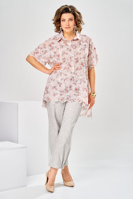 Костюм женский, предназначен для повседневной носки. Костюм женский 2-х предметный, блузка и брюки. Блузка женская прямого силуэта длиной ниже линии бёдер, с фигурным низом. Перед с фигурным подрезом по линии талии, верхняя часть с 2-мя цельнокроеными планками. Спинка с надстрочной кокеткой. Горловина круглая, с втачным воротником рубашечного типа с отрезной стойкой. Застёжка на 6-ть вертикально обмётанных петель и 6-ть пришивных пуговиц на планках переда. Блузка со спущенным плечом. Рукав одно шовный, втачной, длиной до локтя. Боковые швы с разрезами. Блузка без плечевых накладок. Брюки женские, длиной 7/8. Передние половинки с обточными фигурными карманами в боковых швах. Задние половинки с отрезными кокетками. Застёжка центральная на металлическую тесьму-молнию. Брюки с притачным поясом, собранным на эластичную тесьму по задним половинкам, с застёжкой на 1-ну обмётанную петлю и 1-ну пробивную металлическую пуговицу. Низ брюк частично собран на эластичную тесьму. По краю кармана, по шву притачивания кокетки, по боковым швам 2-ная отдельная строчка отделочными нитками. Длина спинки блузки 87 см, ширина изделия на  уровне глубины проймы 63 см, длина рукава 15 см. Длина брюк по боковому шву без пояса 93 см, длина брюк по шаговому шву 68,5 см.