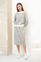 Комплект женский, относится к торжественной одежде. Комплект женский 2-х предметный туника и брюки. Туника женская, прямого силуэта, длиной до середины икры. Перед с 2-мя нагрудными вытачками, выходящими из плечевых швов, со средним швом, заканчивающимся разрезом, с отрезной планкой по горловине, с V-образной вставкой из отделочной ткани. Спинка со средним швом, заканчивающимся разрезом. Боковые швы с разрезами. Горловина круглая, обточная без воротника. Рукав втачной, одно шовной длиной 3/4 с фигурным низом и встречной складкой по центру оката. Туника без плечевых накладок. Брюки женские прямые, длинные. Передние половинки с карманами в боковых швах. Задние половинки с таллиевыми вытачками. Брюки с притачным поясом, собранным на эластичную тесьму, закреплённую 2-мя отделочными строчками. Длина спинки туники 119см, длина рукава 41 см. Длина брюк по боковому срезу 103 см.
