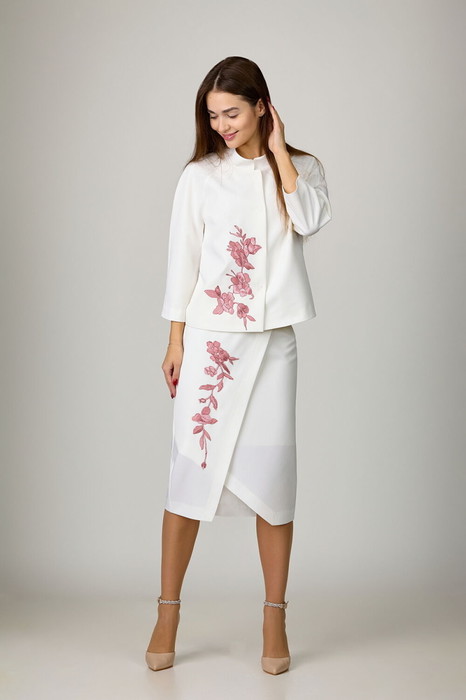 Комплект из костюмной ткани на подкладке, состоящий из жакета и юбки. Жакет прямого силуэта с нагрудными вытачками. Воротник - стойка. Рукава - реглан, трехчетвертные. Жакет застегивается на пришивные кнопки. Юбка на подкладке, с отлетной деталью и поясом-обтачкой. Отделочные настрочные детали по жакету и юбке. В среднем шве заднего полотнища юбки - застежка-молния и разрез.